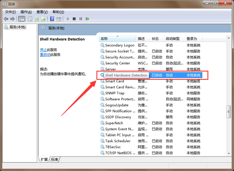 2.在弹出的服务窗口中,找到“Shell Hardware Detection”服务。如下图所示