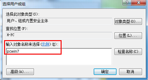 3.最后在选择用户或组窗口中输入用户账户的账户名,点击“检查名称(C)”按钮,再点击确定完成操作。如下图所示