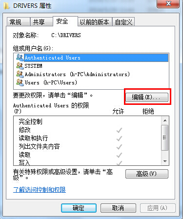 1.右键该文件夹,点击打开该文件夹属性窗口,在文件夹属性窗口中切换到“安全”栏,点击打开“编辑(E)...”按钮。如下图所示