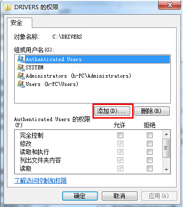 2.接着在弹出的文件夹的权限窗口中,点击“添加(D)...”按钮。如下图所示