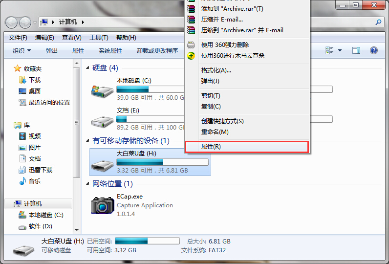 1.首先将u盘插入电脑usb接口并且成功接入电脑,右键u盘图标点击打开u盘属性窗口。如下图所示