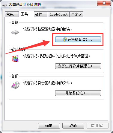 2.在弹出的u盘属性窗口中,将界面切换到“工具”栏,然后点击“开始检查”按钮进入下一步操作。如下图所示