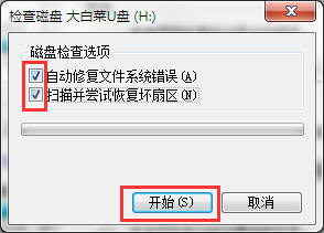 3.在弹出的检查磁盘窗口中,勾选“自动修复文件系统错误”和“扫描并尝试恢复坏扇区”,然后点击“开始”按钮,等待系统对u盘的检测和修复过程即可。如下图所示