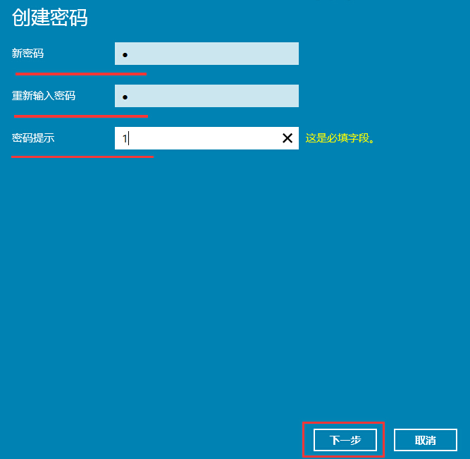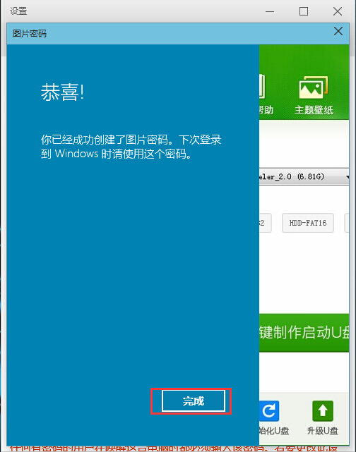 3.创建一个密码以及密码提示,然后点击“下一步”按钮,接着在密码设置成功窗口中点击“完成”按钮。如下图所示