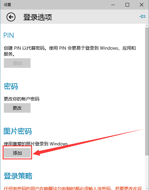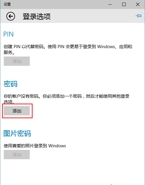 4.返回到登录选项窗口中,在图片密码下面点击“添加”按钮,开始设置图形密码。如下图所示