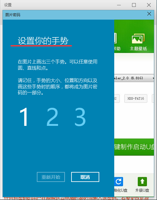 8.图片选择完成之后,进入设置你的手势窗口,点击右侧选好的图片三次,再重新点三次验证即可(建议直接使用点设置比较快捷)。如下图所示