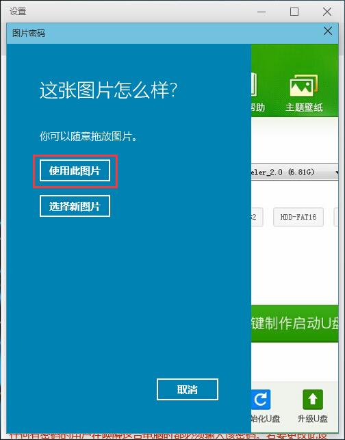 7.接着在图片密码窗口中,点击选择“使用此图片”按钮,添加一张准备好的图片。如下图所示