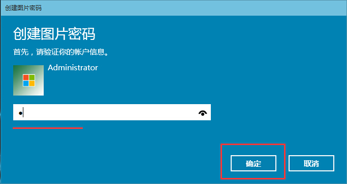 5.在弹出的创建图片密码窗口中输入刚才设置的帐户密码,点击确定进入图片密码创建窗口。如下图所示