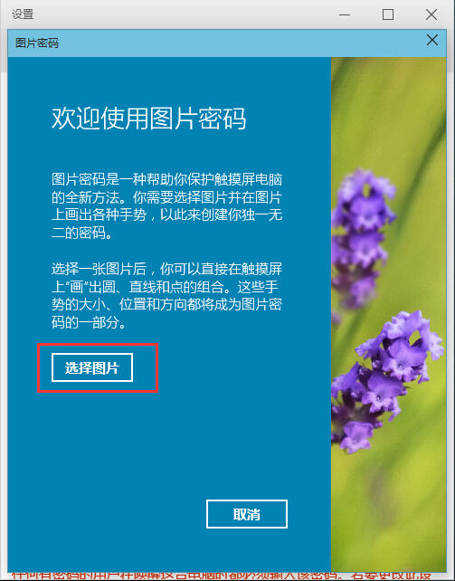 6.在弹出的图片密码窗口中,点击“选择图片”按钮。如下图所示