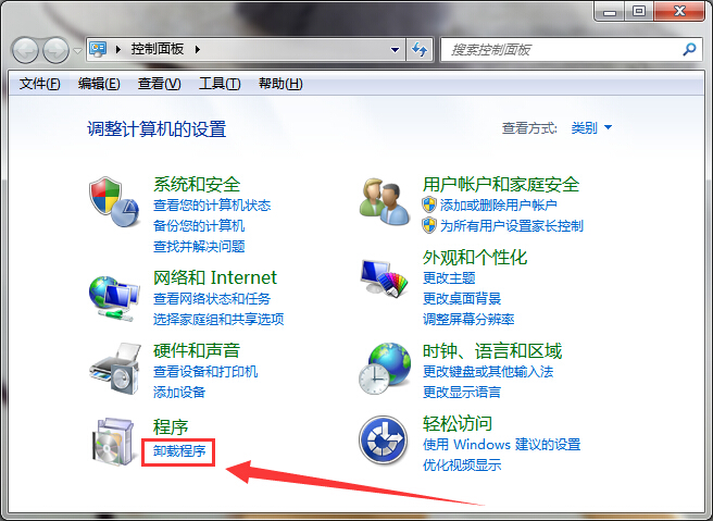 1.登录到系统桌面,点击开始菜单 - 控制面板,在打开的控制面板窗口中点击打开“卸载程序”。如下图所示