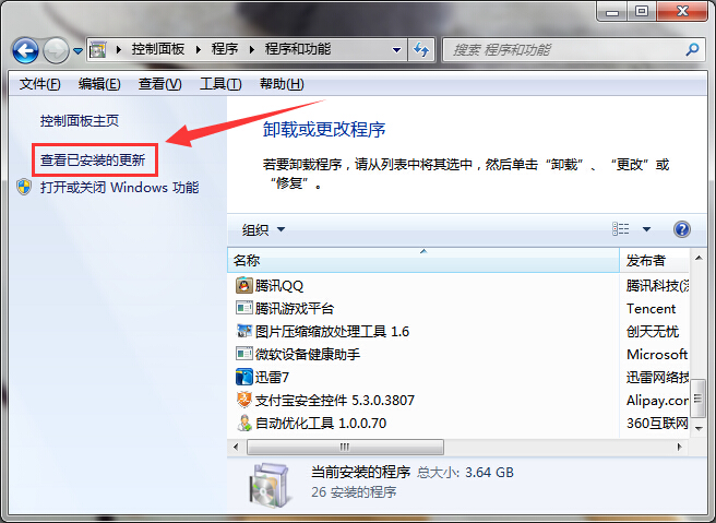 2.在打开的程序和功能窗口中,点击打开窗口左侧的“查看已安装的更新”按钮。如下图所示