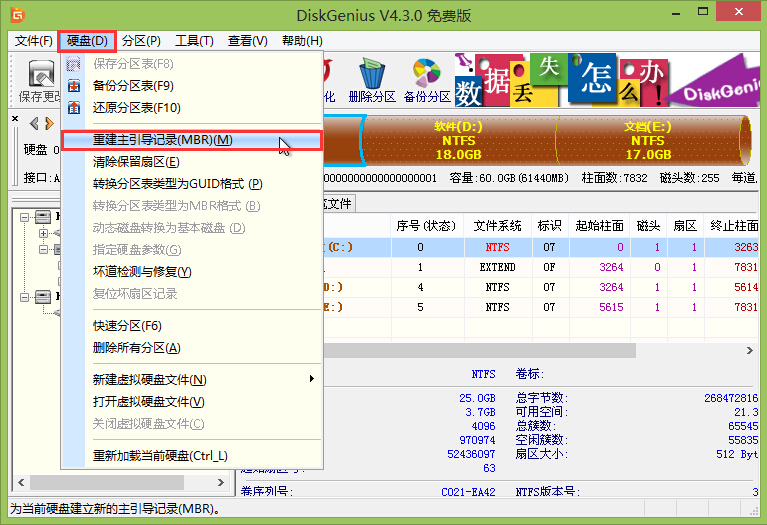 3.在打开的DiskGenius窗口中,点击打开硬盘 - 重建主引导记录(MBR)(M)。如下图所示