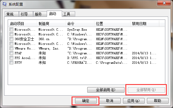 3.同样再系统配置窗口中,切换到“启动”栏界面,点击“全部禁用”按钮禁用全部启动项,然后点击确定完成设置。如下图所示