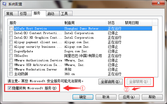 2.在打开的系统配置窗口中,切换到“服务”栏界面,首先点击勾选“隐藏所有Microsoft服务”,然后再点击“全部禁用”按钮。如下图所示