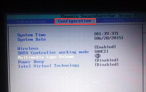 1.按开机键等待电脑出现开机画面的时候按F2键进入BIOS设置界面,在打开的BIOS设置界面中切换到“Configuration”栏界面。如下图所示
