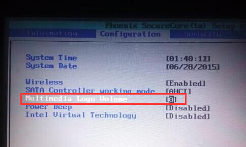 2.接着通过上下方向键移动光标选择“Multimedia Logo Volume”回车确认,将其后面默认数字“1”修改为“0”即可。如下图所示