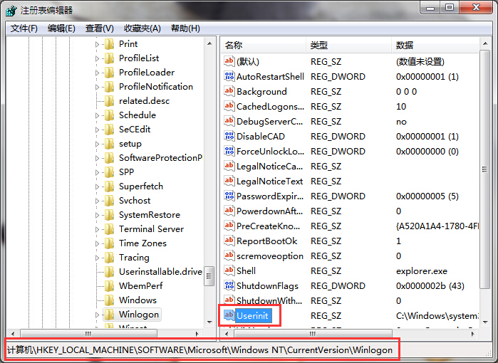 2.在打开的注册表编辑器窗口中,依次展开:HKEY_LOCAL_MACHINE\SOFTWARE\Microsoft\Windows NT\Current Version\Winlogon项,然后在Winlogon项的右侧界面中找到“Userinit”值。如下图所示