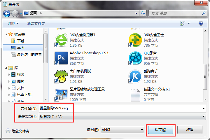 2.在记事本窗口中点击文件 - 另存为,将记事本另存为文件名为“批量删除SVN.reg”,保存类型为“所有文件”的reg格式文件。如下图所示