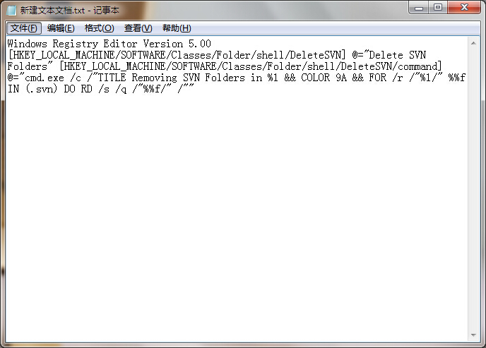 Windows Registry Editor Version 5.00 [HKEY_LOCAL_MACHINE/SOFTWARE/Classes/Folder/shell/DeleteSVN] @="Delete SVN Folders" [HKEY_LOCAL_MACHINE/SOFTWARE/Classes/Folder/shell/DeleteSVN/command] @="cmd.exe /c /"TITLE Removing SVN Folders in %1 && COLOR 9A && FOR /r /"%1/" %%f IN (.svn) DO RD /s /q /"%%f/" /""