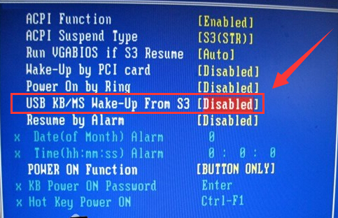 2.在打开的Power Management Setup设置窗口中,移动光标选择“USB Wake-Up From S3”回车确认,在弹出的小窗口中选择“Disable”回车确认,最后按F10键保存设置并且关闭电脑即可。如下图所示