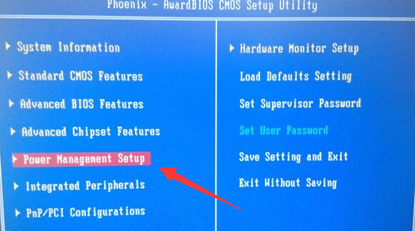 1.开机按快捷键进入BIOS设置界面,然后在BIOS设置界面中移动光标选择“Power Management Setup”回车确认。如下图所示
