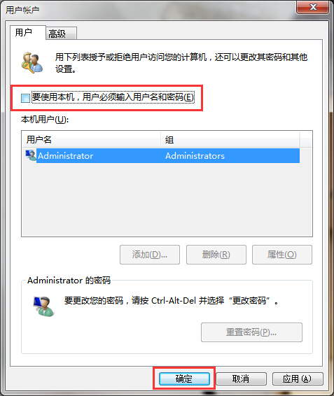 2.在打开的用户账户窗口中,在“用户”栏界面中点击取消勾选“要使用本机,用户必须输入用户名和密码”,点击确定完成操作。如下图所示