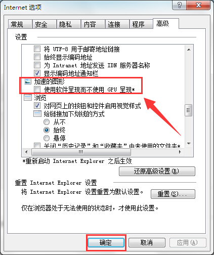 2.在打开的Internet选项窗口中,切换到“高级”栏界面,然后拖动滚动条点击取消勾选“使用软件呈现而不使用CPU呈现*”,点击确定完成操作并且重启浏览器即可。如下图所示