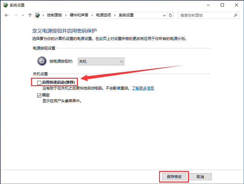 5.这时候用户们可以看到,关机设置下面的选项已经可以进行操作了,首先点击取消勾选“启用快速启动(推荐)”,然后点击“保存修改”按钮并且重启电脑。如下图所示