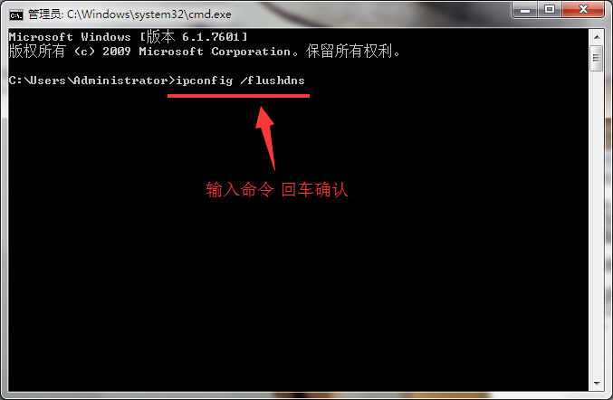 2.在打开的命令提示符窗口中输入命令“ipconfig /flushdns”回车确认。如下图所示