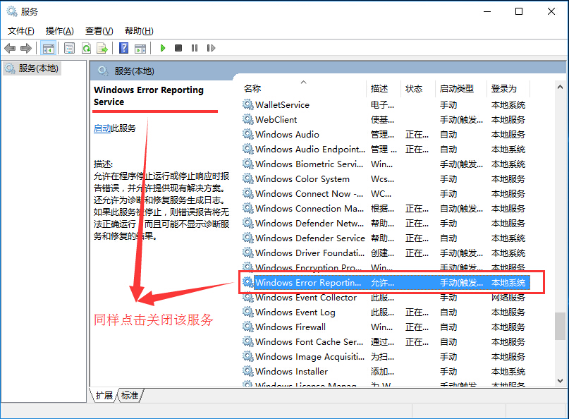 3.接着继续拖动滚动条找到“Windows Error Reporting Service”,同样的点击关闭Windows Error Reporting Service服务,完成操作之后重启电脑即可。如下图所示