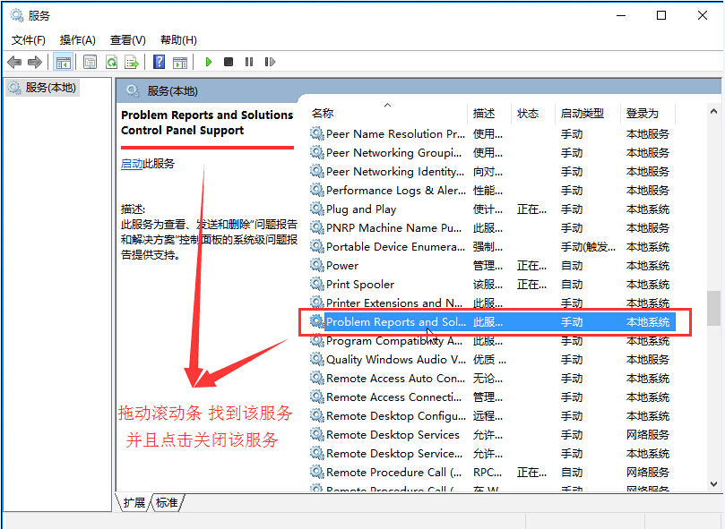 2.在打开的服务窗口中,拖动滚动条找到“Problem Reports and Solutions Control Panel Support”并且点击关闭Problem Reports and Solutions Control Panel Support服务。如下图所示