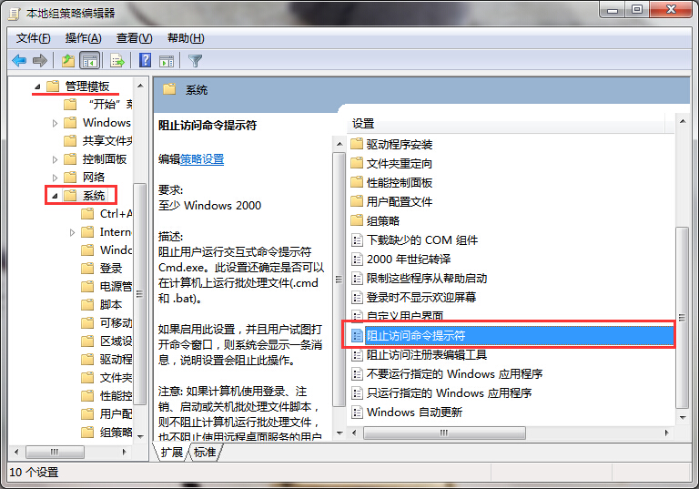 2.在打开的本地组策略编辑器窗口中,依次展开:用户配置 - 管理模板 - 系统,然后在系统设置右侧界面中找到“阻止访问命令提示符”。如下图所示