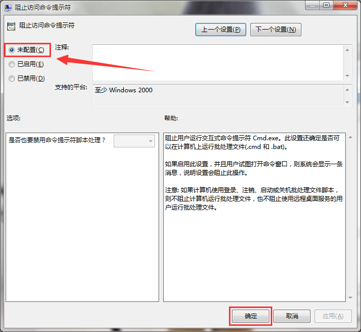 3.双击打开“阻止访问命令提示符”,在弹出的阻止访问命令提示符窗口中,点击选择“未配置(C)”然后点击确定按钮完成操作。如下图所示