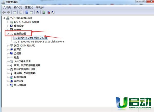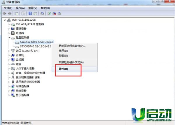 3、展开“磁盘驱动器”,右击需要提升u盘传输速度的磁盘,选择属性,如图: