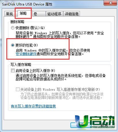 4、在u盘属性框中将选项卡切换到“策略”,然后选择“更好的性能”,单击确定即可。如图: