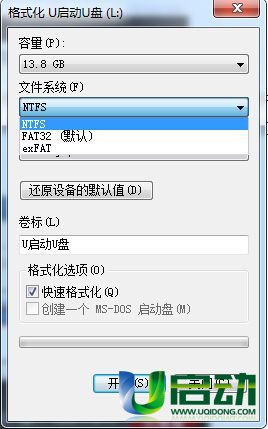 5、之后我们再检查下u盘是什么格式,一般目前u盘普遍为FAT32与NTFS分区格式,其中NTFS分区格式在win7系统拥有更佳性能,如果u盘不是NTFS格式,那么建议格式化u盘,格式化的时候选择NTFS格式即可,如图: