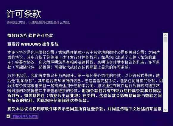 1.将从网络上下载下来相对应的32位或者是64位的ISO系统镜像包打开,运行之后跳转到以下界面,勾选“我接受许可条款”然后点击“下一步”进入下一步操作。如下图所示
