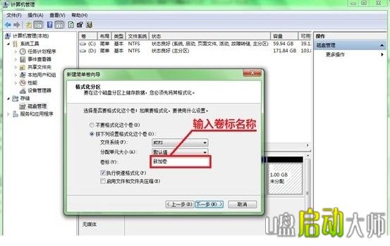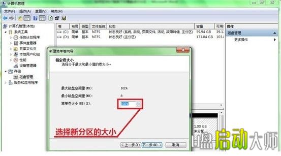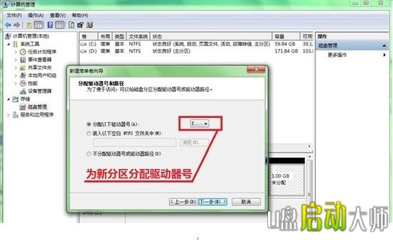 下一步就是建立新的磁盘卷,右击新划分出来的区域,选择“新建简单卷”会进入“新建简单卷向导”,首先要选择新建分区的大小,这里我选择将刚才压缩出的空间全部划分为一个分区,也就是1024。然后按“下一步”,会让我们选择新建卷的驱动器号,选择“T”好了。继续“下一步”,在这里可以选填卷标,就在“示例1”的地方,比如新分区用来存放音乐,可以填“音乐”,不填的话也没有影响,其他的设置默认就可以了。在完成这一系列操作以后,新的分区就建立好了!