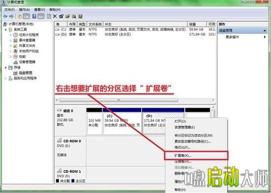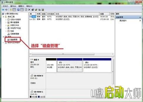 首先点击“开始”,右击“计算机”进入“管理”。会进入到一个叫做“计算机管理”的界面,找到左边目录中“存储”下的“磁盘管理”并且选中,这时候中间的界面就会出现磁盘的详细信息