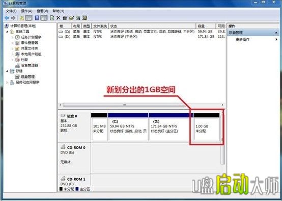 之后我们可以看到在D盘右边多了一块区域,这就是我们刚才分出来的那1G空间。就好比一块空地只有盖了楼大家才能住进去一样,这1G的空间并不能直接使用,需要建立成磁盘卷以后才能使用。
