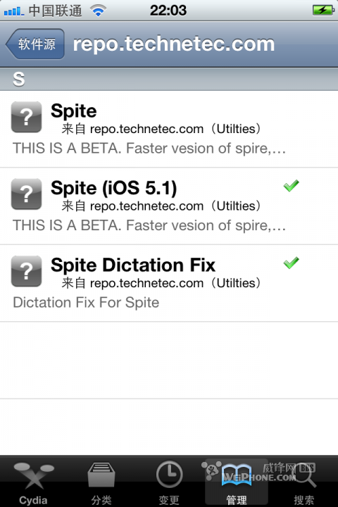 因为bigboss源的官方版Spire仅支持iOS5.0,iOS 5.0.1,因此咱们需安装不是官方版Spire,详细名称事实上是为Spite,国外达人的Spire更改版。
