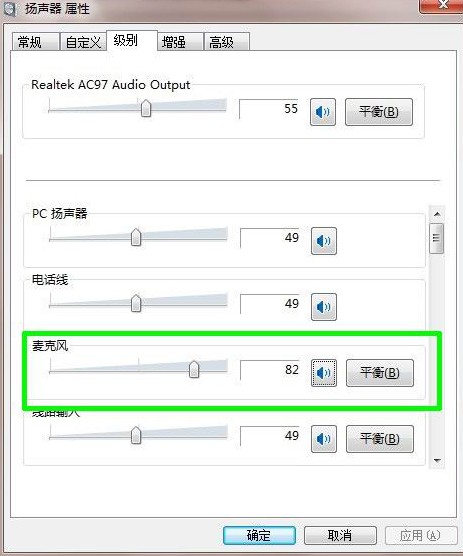 第九、选取“级别”栏目,此时咱们通常看见麦克风那项被静音,此时咱们取消静音,且设置好麦克风音量。调整完成,最后点击确定。