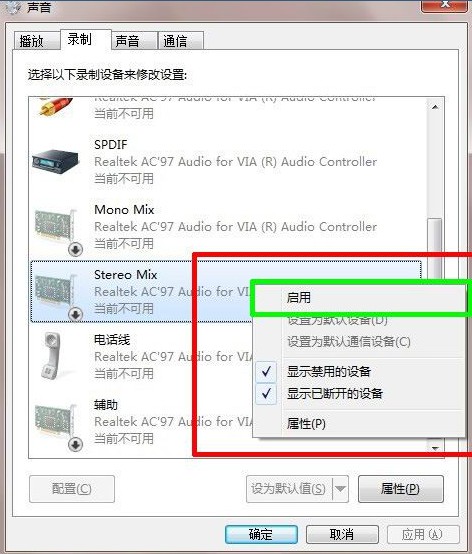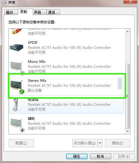 第五、这时stereo mix选项已变为默认设备,已经能够使用了。