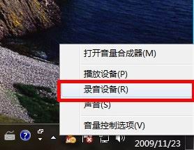 第一、在小喇叭处通过鼠标右键单击,选取录音设备。