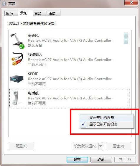 第二、进至录音设备菜单,咱们可以看到是无stereo mix此选项的,此时咱们在空白的地方通过鼠标右键单击,选取“显示禁用的设备”。