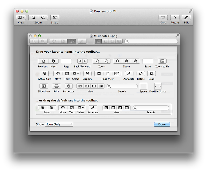 在OS X 10.8系统里,苹果给预览程序的工具栏带来了两类变化:第一类,按键不再支持自定义了。预览并非只有一个取消自定义功能的应用,美洲狮系统下的打印与扫描功能窗体的工具栏也无法自定义了。