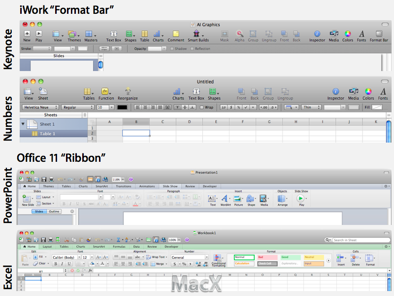 new设计体现苹果希望提高工具栏实用性,同时,苹果还希望把工具栏的设计尽最大可能地简化。苹果的竞争对手微软的想法和苹果刚好相反,接下来是iWork与Office的比较,微软希望把全部功能转移至Office的工具栏上,而苹果却尽最大可能简化工具栏。