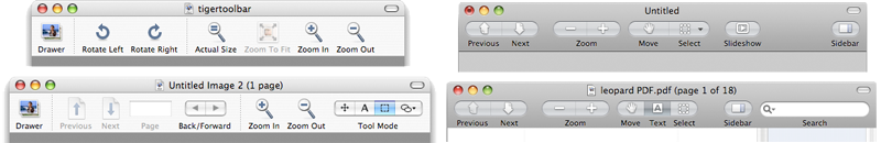 2003年苹果推出了OS X 10.3 Jaguar,此时OS X有了Aqua风格的工具栏。Safari里有了灰色风格的方形工具图标,最后此类风格的图标进至了Finder与别的预载应用。2007年推出的 OS X 10.5 Leopard里,Mail程序有了椭圆形的抛光工具栏图标,然后包含预览程序以内的许多软件均开始使用此类风格。