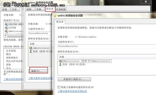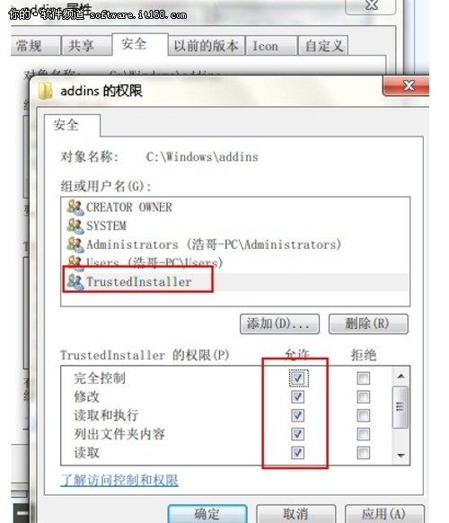 第三.在文件夹属性里,设置文件或者文件夹之TrustedInstaller权限,点击上方导航栏里“安全”选项卡,进至“编辑”,在权限窗体上栏里又一次选取登录系统的管理员用户,在下边的选项卡里都点击“允许”,一直点击确认,如此便具有了这个文件或者文件夹的管理权限。