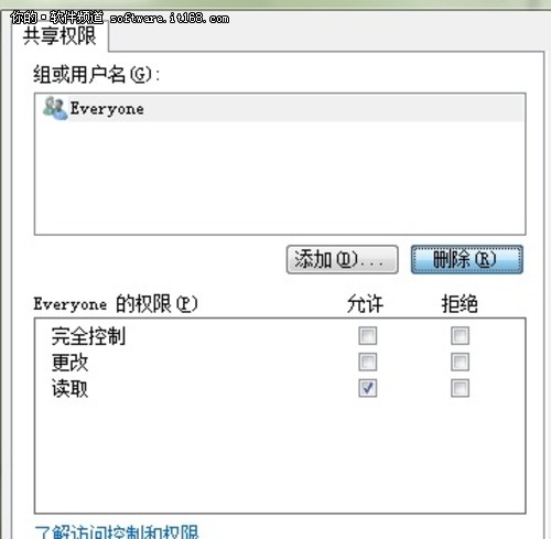 第三. 如此便在跳出的权限配置对话框里,选取默认的"Everyone"组,删了它。
